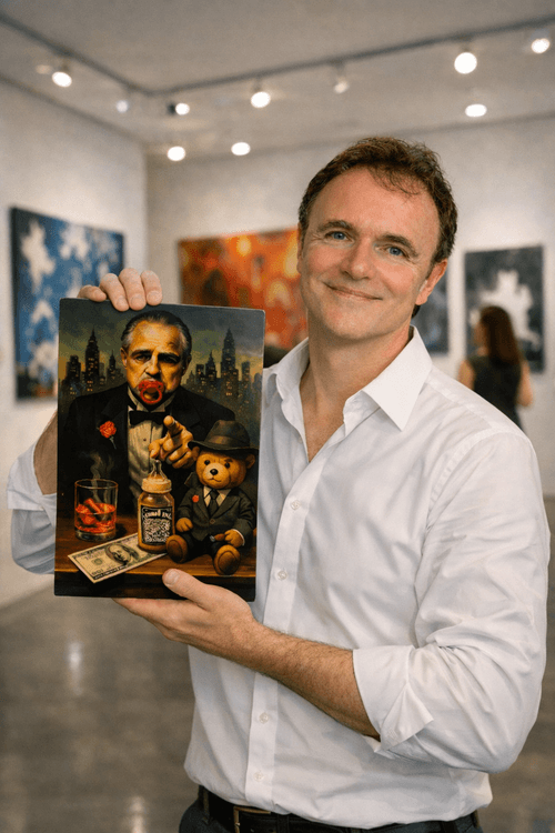 A pop-culture classic set against an explosive urban mural, with flying banknotes and victory energy. A sharp satire of value, luck, and excess. Bold presence for collectors who enjoy art that provokes and entertains.