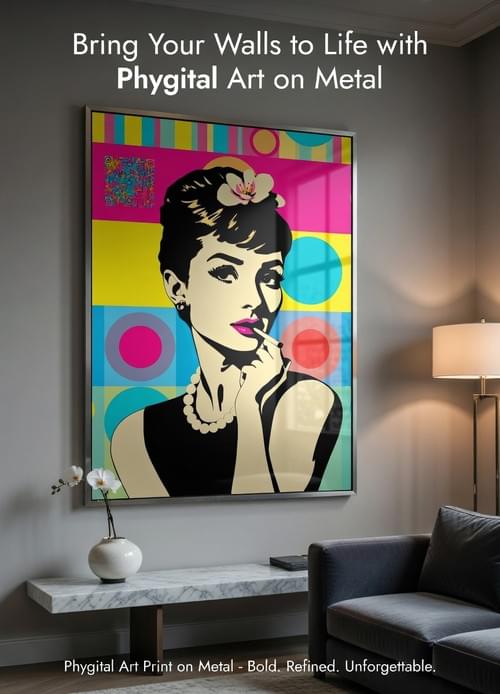 Audrey is a limited-edition artwork by Patrick Osinski in 84 × 60 cm (33.1 × 23.6 in), printed on premium metal with rounded corners. It pairs a bold pop-art portrait of Audrey Hepburn with a hidden interactive layer through an integrated artistic QR code that unlocks a private AR animation made for this piece. The result is two experiences in one: elegant, gallery-ready art from a distance, and exclusive digital content up close on your phone. The metal finish delivers high gloss, vivid color, and sharp detail, with fade, scratch, and weather resistance, plus a lightweight but solid build and easy cleaning.