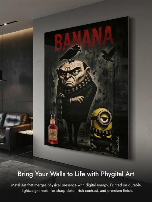 A 42×60 cm (16.5×23.6 in) phygital artwork in a matte black gallery frame with graphite mat, this piece blends noir atmosphere, acerbic humor, and pop-culture critique through a dark anti-hero scene where BANANA becomes a visual manifesto. Printed on premium metal, it includes a discreet integrated QR design that unlocks an exclusive AR layer: animated bottle effects, moving scene elements, and collector-only easter eggs. Activation is simple, tap or scan, step back, and watch the wall come alive. The aluminum finish provides intense gloss, vivid color, sharp detail, and strong long-term durability with fade, fire, and scratch resistance, while remaining lightweight, robust, and easy to clean.