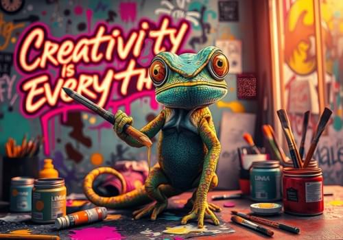 Um camaleão artista, pincel na mão, em um estúdio vibrante onde o recado é claro: Creativity is Everything. Cores neon, textura rica e humor inteligente. É peça para levantar a energia de qualquer espaço.