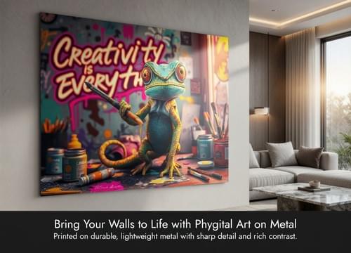 Creativity is Everything is an 60 × 84 cm (23.6 × 33.1 ). phygital artwork by Patrick Osinski, framed in matte black for a gallery-style finish. Featuring a chameleon artist in a vibrant studio, it delivers a bold message about creativity as the true advantage in an AI-saturated world. Beyond the physical piece, a near-invisible QR/NFC trigger unlocks an exclusive AR layer: animated movement, glowing lettering, paint effects, and hidden details. Activation is simple, just tap or scan, step back, and watch it come alive with no app required. Printed on premium metal, it offers vivid shine, sharp detail, fade and scratch resistance, lightweight durability, and easy maintenance.