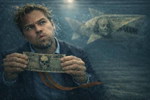 Di Caprio Phygital art 84x60cm Shark Marketis a bold phygital artwork that turns money, danger and illusion into one unforgettable image.