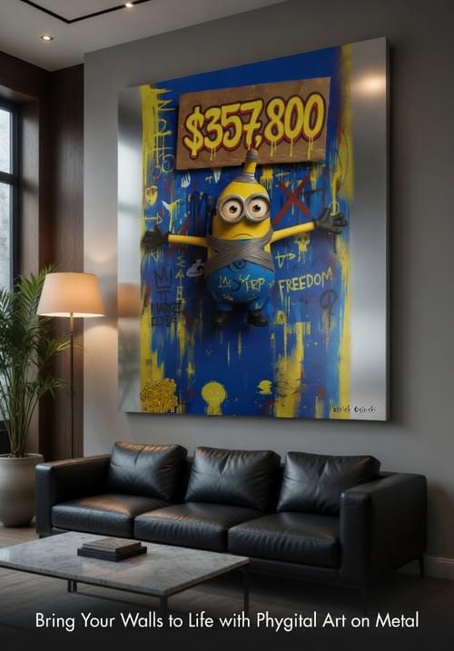 84 × 60 cm = 33.1 × 23.6 inches pop-urban metal artwork designed to trigger instant reactions, this piece blends acid humor, sharp social critique, and a premium gallery-level finish. At first glance, it reads as bold contemporary wall art. Then the hidden phygital layer appears. An invisible QR design unlocks an exclusive AR experience with animated effects, surprise details, and collector-only content, with no app required. Just tap or scan, take one step back, and watch the work come alive directly on your wall. Produced on fine-art metal and presented in a matte-black gallery frame, it is ready to hang, built for long-term display, and designed to keep evolving through an updatable digital layer over time.