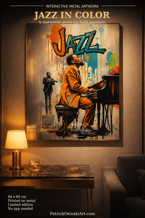 Jazz Club60 × 84 cm (23.6 × 33.1 ) Metal Edition is a limited-series phygital artwork priced at $1,130.00, built around the emotional core of jazz: silence, tension, and confession over performance. The piece shows an intimate club scene in warm amber light, where a pianist plays with eyes closed, focused on feeling rather than showmanship. Printed on premium metal in 84×60 cm (33.1×23.6 in) format, it includes an embedded NFC chip with no visible QR code. Bring your phone close to unlock an exclusive AR experience with 3D animation and ambient sound, with no app or setup. It comes with satin finish, rounded corners, ready-to-display presentation, and strong durability: vivid sharp color, fade and scratch resistance, and a lightweight but solid build for easy installation.