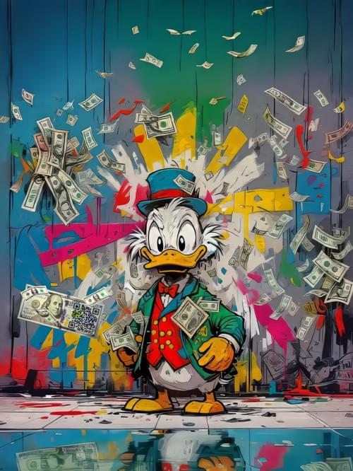 Um clássico da cultura pop em frente a um mural urbano explosivo, com notas voando e energia de vitória. É sátira de valor, sorte e excesso. Forte presença visual para quem gosta de arte que provoca e diverte.