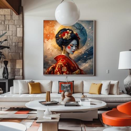 This 80 x 80 cm phygital artwork blends elegance, mystery, and visual impact. Inspired by Japanese aesthetics, it portrays a contemporary geisha in a poetic atmosphere shaped by moonlight, silence, and inner tension. The deep red kimono, the delicacy of the face, and the dreamlike background create a presence that feels both powerful and refined.