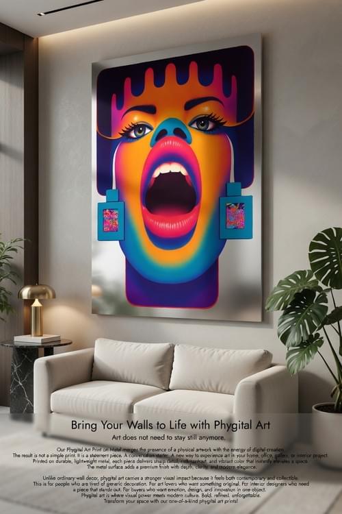 It fuses disco energy and Pop Art culture into one collectible piece. On the wall, you see a bold, vibrant portrait. Scan the right earring, and a 3D disco dancer appears in your space with an original soundtrack. You can move around it, film it from any angle, and share it like pro content.