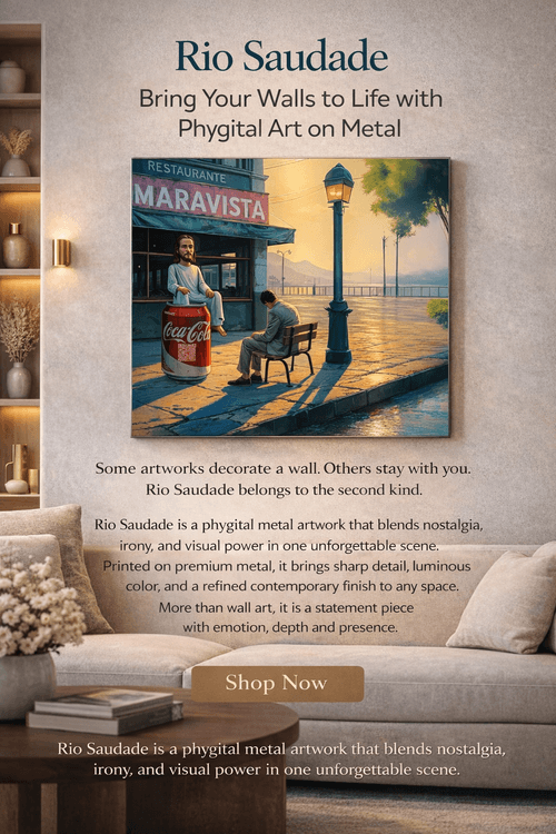 Phygital Artwork, Rio, Fraternity & Glamour is a limited-edition 84 × 60 cm (1.6 × 23.6 inches). premium metal piece that stages a bold, surreal scene: Jesus Christ on a giant Coca-Cola facing a silent man against Rio’s melancholic glow. More than wall art, it is a statement work with a hidden second layer. By scanning with your phone, you unlock exclusive digital content, including 3D animation and video, which deepens the story and emotional impact. The piece is signed, numbered, and shipped free. Made on a lightweight, rigid, elegant metal plate, it delivers vivid color, deep gloss, strong detail, plus fade and scratch resistance, easy installation, and simple cleaning.