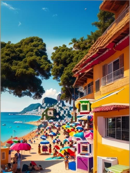 Um cartão-postal vivo de Rio de Janeiro: morros ao fundo, mar turquesa, casarios coloridos e uma avenida de guarda-sóis em ritmo de verão. Luz intensa, cores saturadas e aquela alegria carioca que enche a parede.