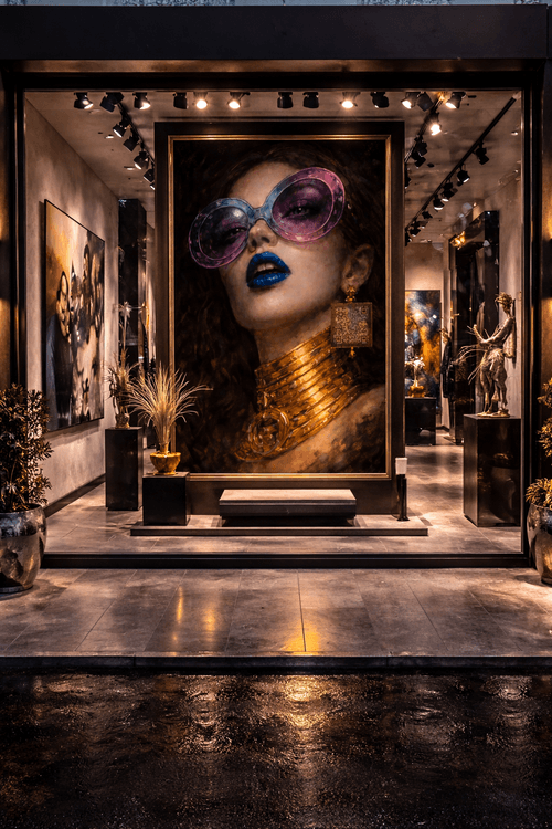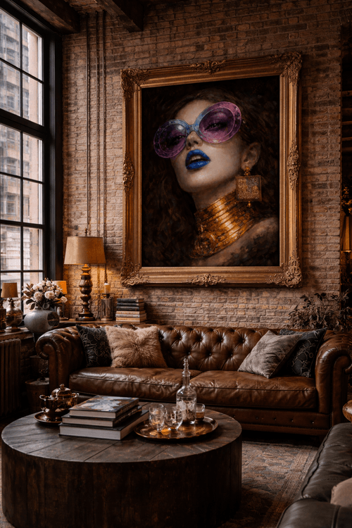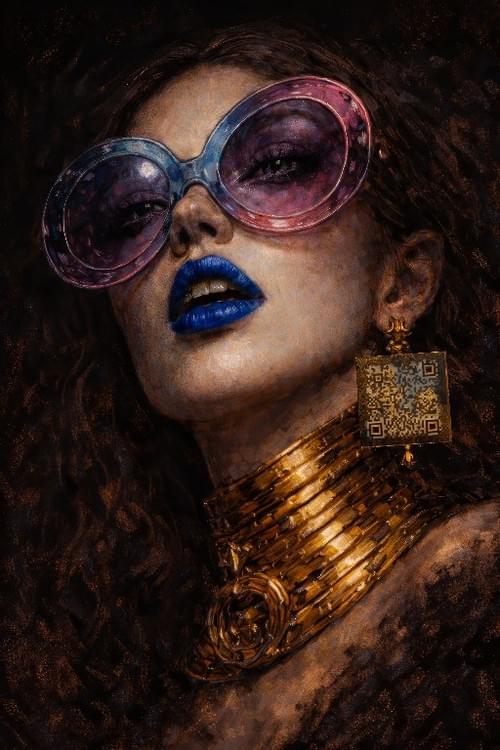 The Earring of Secrets is a large-format phygital artwork on canvas that blends sensual portraiture, mystery, and digital illusion. At first glance, the piece captivates through its intense gaze, deep painterly texture, and bold contrast between luminous blue lips, oversized tinted glasses, and sculptural gold jewelry.