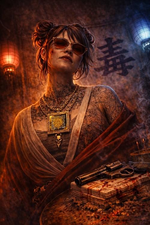 Printed on premium metal in 84 x 60 cm, this phygital artwork combines cinematic tension, dark beauty, and hidden technology in one collector piece. The custom design QR code is fully integrated into the image.