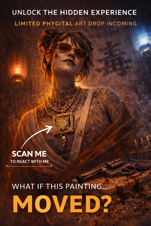 Integrated into the artwork is a custom design QR code, hidden inside the composition itself. Once scanned with a smartphone, it unlocks an exclusive digital layer and transforms the piece into an interactive phygital experience.